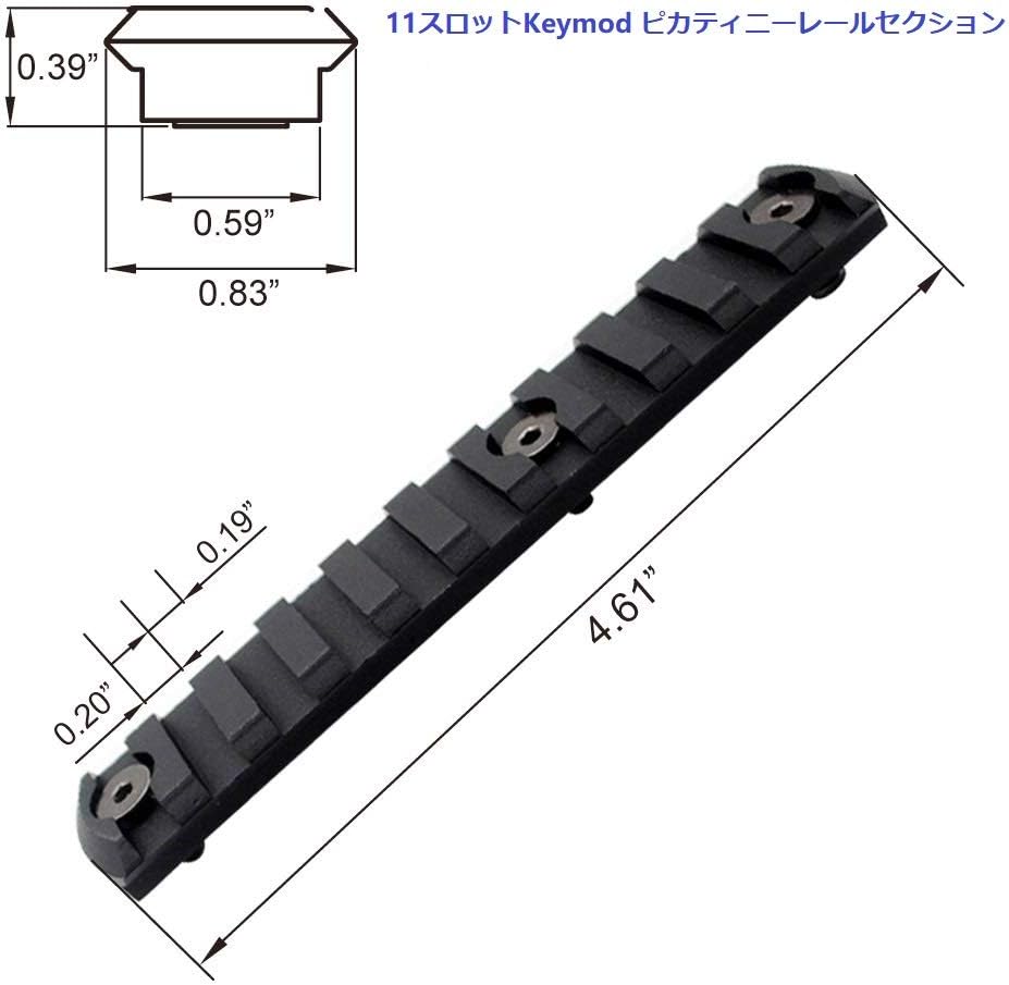 Package included: One piece * 5 slots keymod rail section One piece * 7 slots keymod rail section One piece * 9 slots keymod rail section One piece * 11 slots keymod rail section One piece * 13 slots keymod rail section Steel Screws & Allen Wrenches. The keymod Picatinny rail sections are subject to 1913 Mil-spec, that are in high quality control standards to ensure a proper fit to your keymod handguards and other weaver rail mount system. Picatinny rail sections are made of 6061-T6 Aluminum with CNC precision process,which are scratch proof, and smooth finished with black color. Easy to install with rifle and airsoft accessories such as sling mounts, bipods, flashlights, grips in mlk system. Length: 5 slots: 2.25 inch ; 7 slots: 3.04 inch ; 9 slots: 3.83 inch ; 11 slots: 4.61 inch ; 13 slots: 5.40 inch. Width: 0.83 inch Height: 0.39 inch Net Weight: 19g for 5 slots; 25g for 7 slots; 32g for 9 slots; 38g for 11 slots; 44g for 13 slots